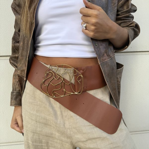 Cinto con hebilla en bronce y guampa pegada y engarzada, faja de cuero color marrón.